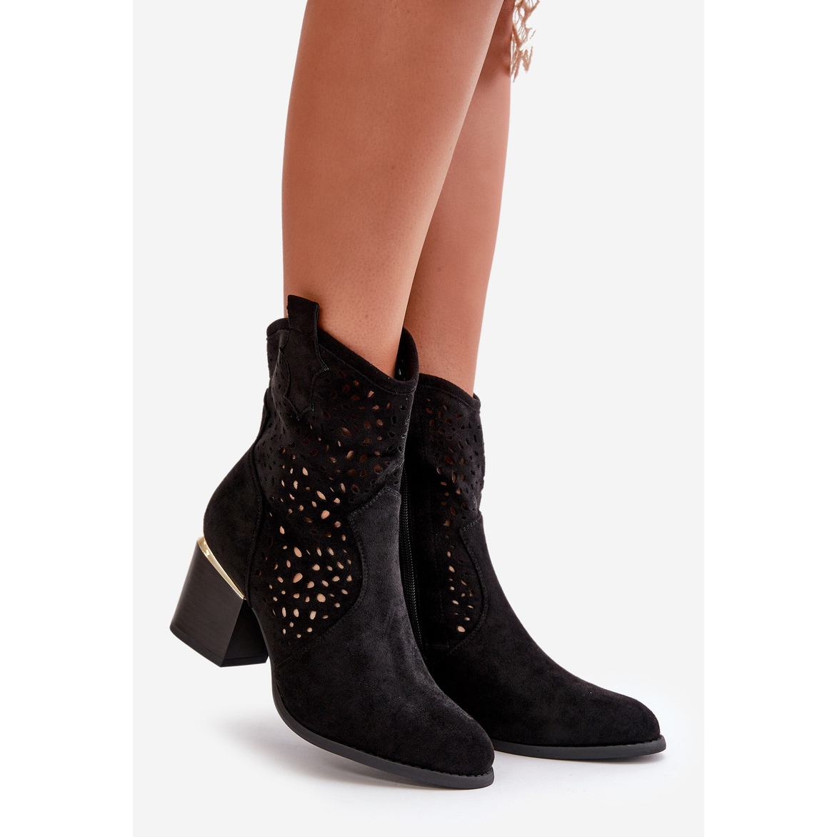 Inna marka Ażurowe Botki Na Słupku Z Eko Zamszu Zapinane Na Zamek Czarne Sevana