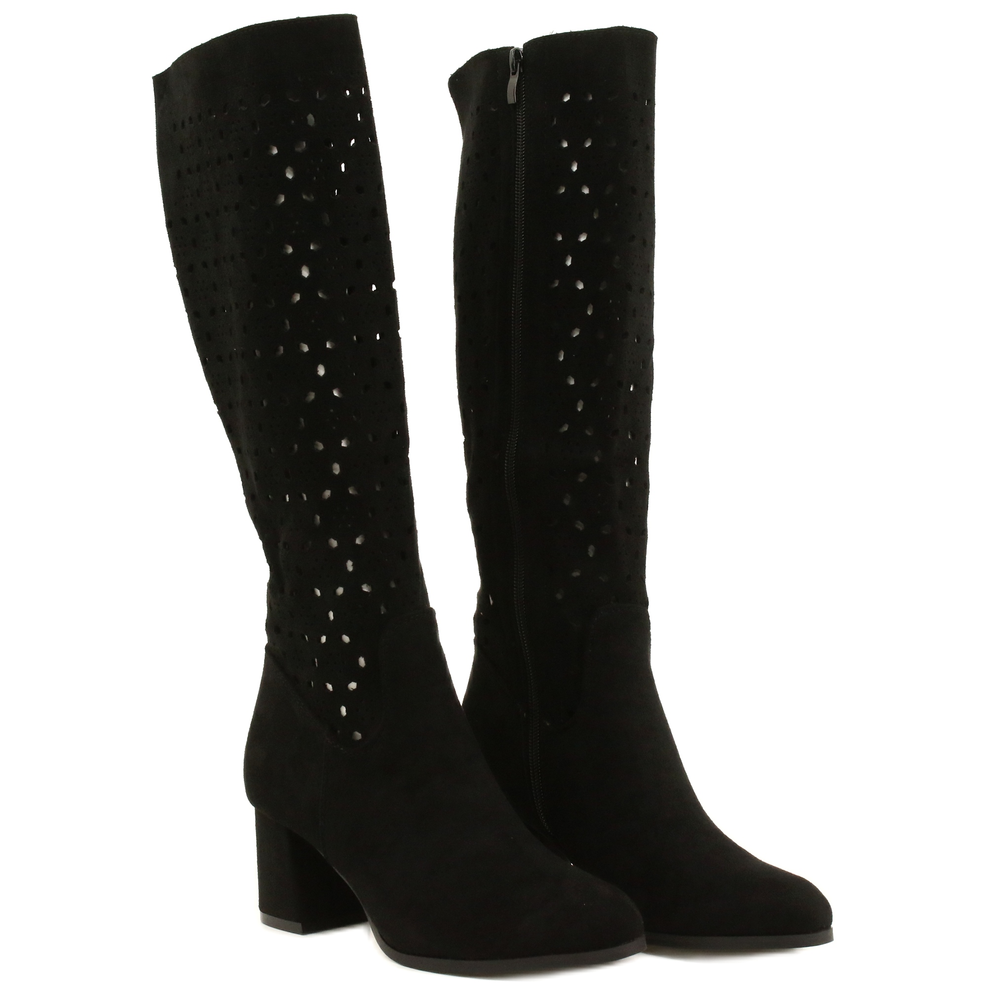 Wykonane z wysokiej jakości zamszowej skóry ekologicznej, ażurowe kozaki oferują nie tylko estetyczny wygląd, ale również wygodę noszenia. Miękki materiał dopasowuje się do stopy, a zaokrąglony nosek dodaje im lekkości. Cholewka o wysokości do kolana jest zapinana na suwak, co ułatwia zakładanie, a ozdobne wycięcie na górze podkreśla ich unikalny charakter.