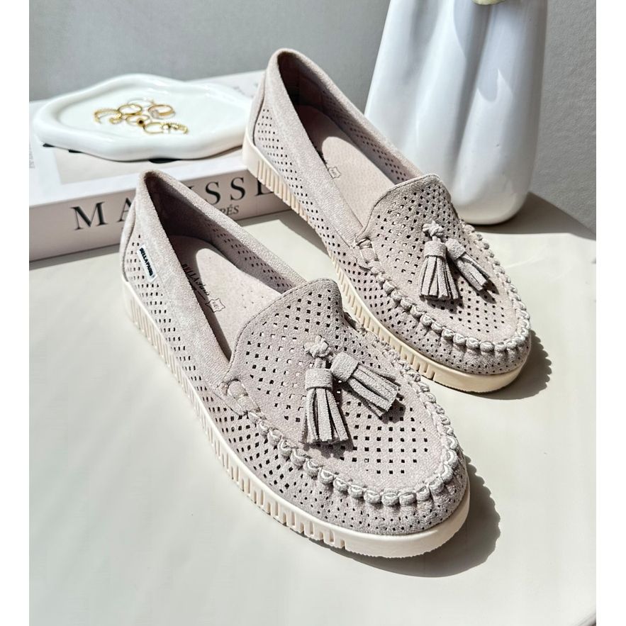 Szczegóły: Ażurowe Mokasyny Damskie Z Eko Zamszu Beżowe Tinami beżowy