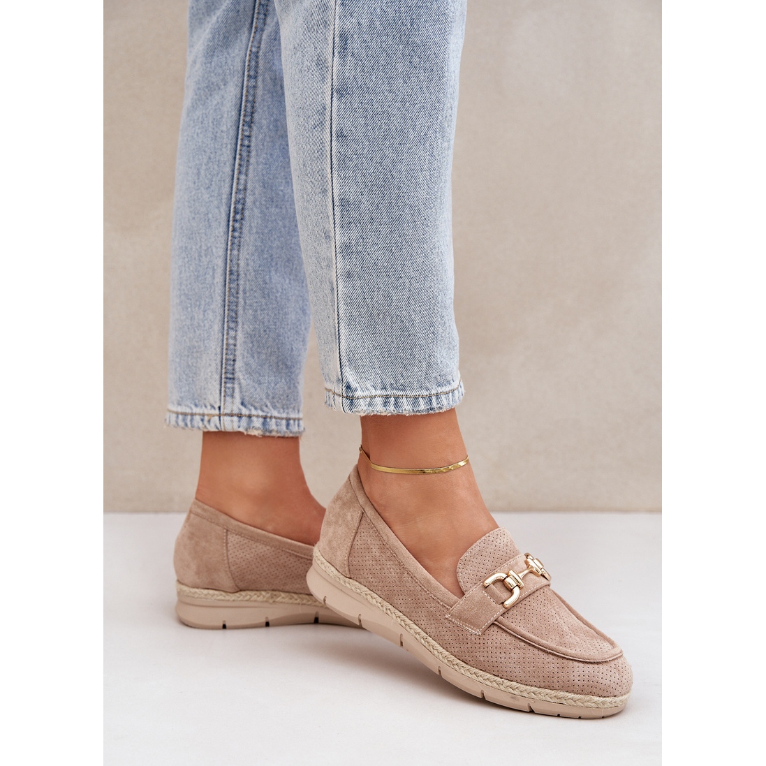 Szczegóły: Ażurowe Mokasyny Ze Złotym Detalem I Jutową Plecionką Beżowe beżowy