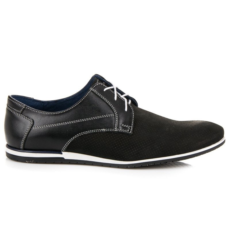 Stylowe i uniwersalne półbuty LUCCA w kolorze czarnym to propozycja dla mężczyzn ceniących klasykę z nutą sportowego luzu. Wykonane ze skóry naturalnej — zarówno zewnętrznie, jak i wewnętrznie — zapewniają komfort noszenia i elegancki wygląd. Ażurowa cholewka dodaje lekkości i poprawia wentylację stopy, a kontrastowa, biała podeszwa podkreśla młodzieńczy, casualowy charakter modelu. Sznurowane zapięcie gwarantuje dobre dopasowanie, a okrągły nosek i 2 cm podwyższenie zapewniają wygodę przez cały dzień.