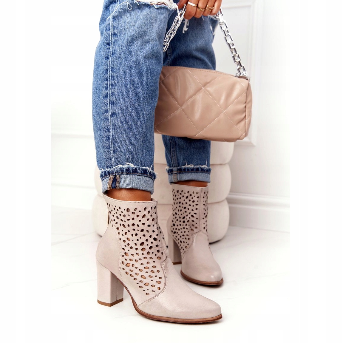 Szczegóły: Ażurowe Skórzane Botki Na Słupku Exquisite 1219 Cappuccino beżowy