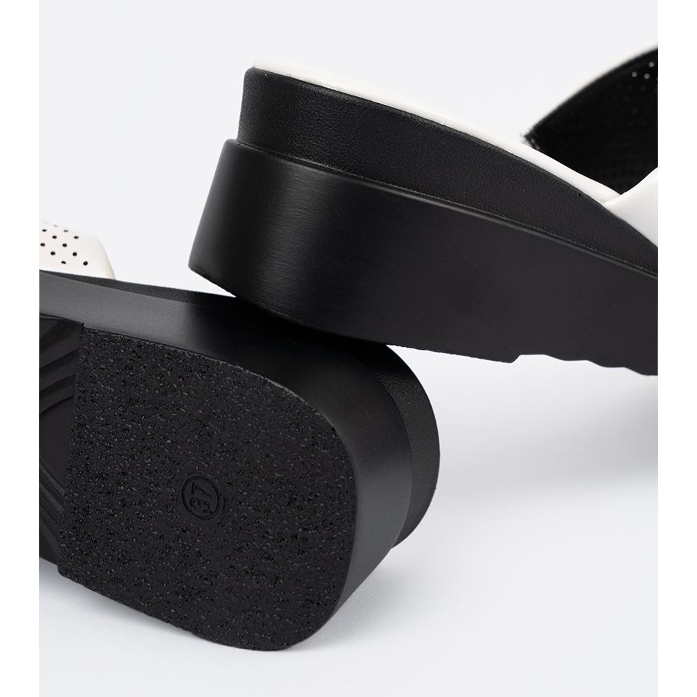 Praktyczna podeszwa z tworzywa sztucznego gwarantuje odpowiednią przyczepność oraz wygodę noszenia, czyniąc te klapki idealnym towarzyszem zarówno na spacerze, jak i podczas spotkań z przyjaciółmi. Klasyczne połączenie białego koloru z czarną podeszwą sprawia, że łatwo dopasujesz je do swoich ulubionych letnich sukienek czy casualowych denimowych stylizacji.