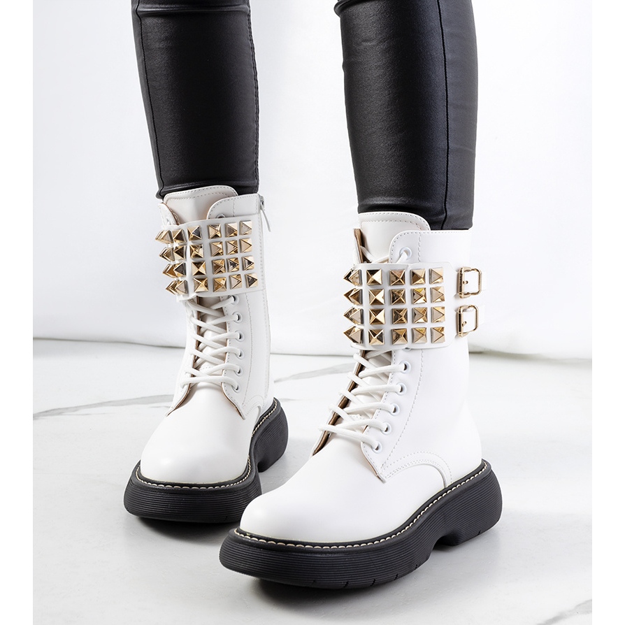 Białe botki z ćwiekami Lacer to nie tylko obuwie, ale prawdziwy wyraz stylu, który nada wyjątkowego charakteru każdej stylizacji. Ich cholewka wyróżnia się oryginalnym paskiem ozdobionym złotymi ćwiekami, co sprawia, że prezentują się efektownie i modnie. Wykonane z wysokiej jakości skóry ekologicznej, botki zapewniają komfort noszenia przez cały dzień.
