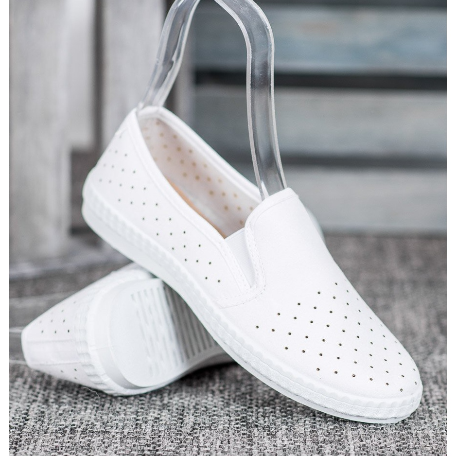 Cholewka sliponów została wykonana z trwałej tkaniny w kolorze białym, co nadaje im uniwersalny charakter. Ażurowy wzór zapewnia odpowiednią wentylację, dzięki czemu stopy pozostają świeże nawet w cieplejsze dni. Zaokrąglony nosek oraz zabudowany, miękki zapiętek gwarantują wygodę noszenia, a system wsuwania ułatwia zakładanie butów.