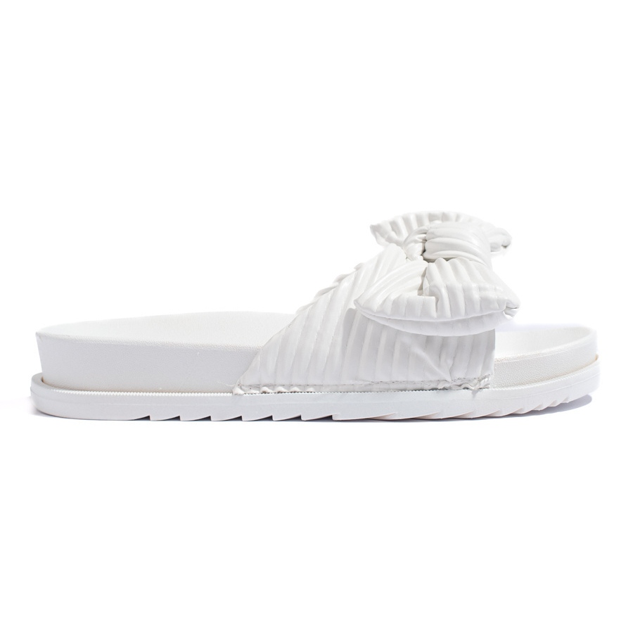 Podeszwa wykonana z tworzywa sztucznego o wysokości 3 cm zapewnia stabilność oraz amortyzację, dzięki czemu każdy krok staje się przyjemnością. Klapki mają wsuwane zapięcie, co ułatwia ich zakładanie i zdejmowanie, a biały kolor podkreśla ich elegancję.