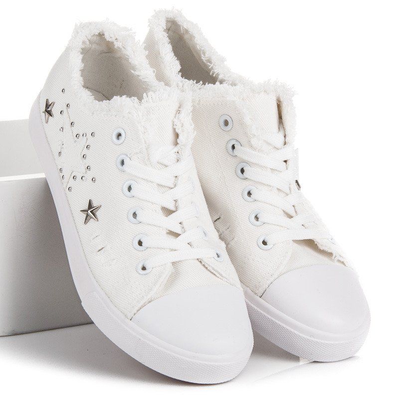 Odkryj subtelną elegancję w białych materiałowych trampkach, które będą doskonałym uzupełnieniem każdej stylizacji. Te wyjątkowe buty charakteryzują się śnieżnym odcieniem oraz unikalnym wykończeniem wokół kostki, które nadaje im dziewczęcego uroku. Zdobienia w postaci delikatnych kropeczek i gwiazdek sprawiają, że trampki wyróżniają się, jednocześnie zachowując minimalistyczny styl.