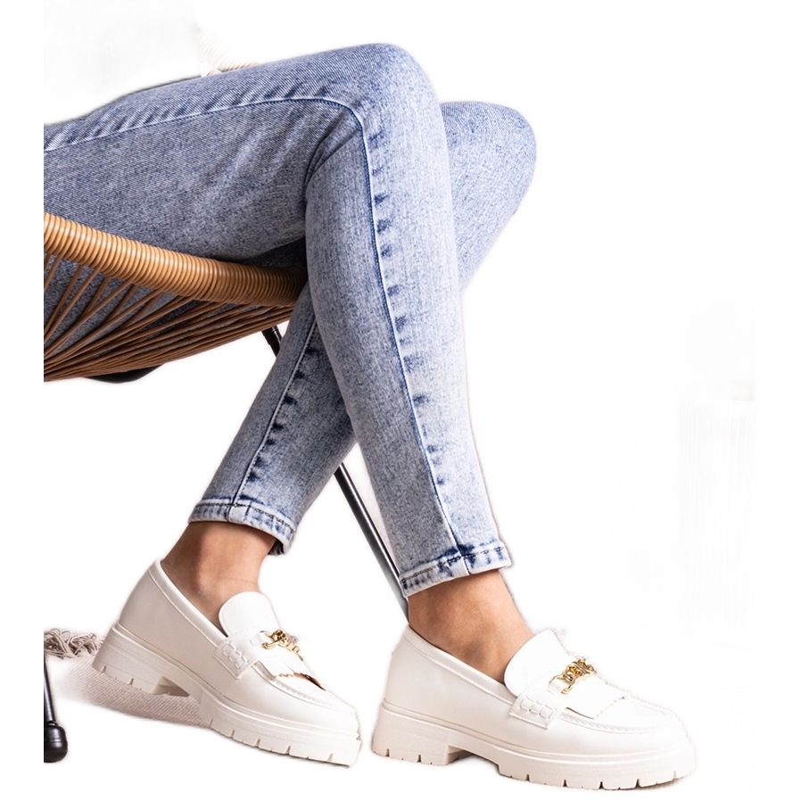 Białe mokasyny z frędzlami i złotym łańcuszkiem to idealne dopełnienie zarówno codziennych, jak i bardziej eleganckich stylizacji. Bez względu na okazję, te buty z pewnością przyciągną spojrzenia i dodadzą Twojemu outfitowi odrobiny szyku.