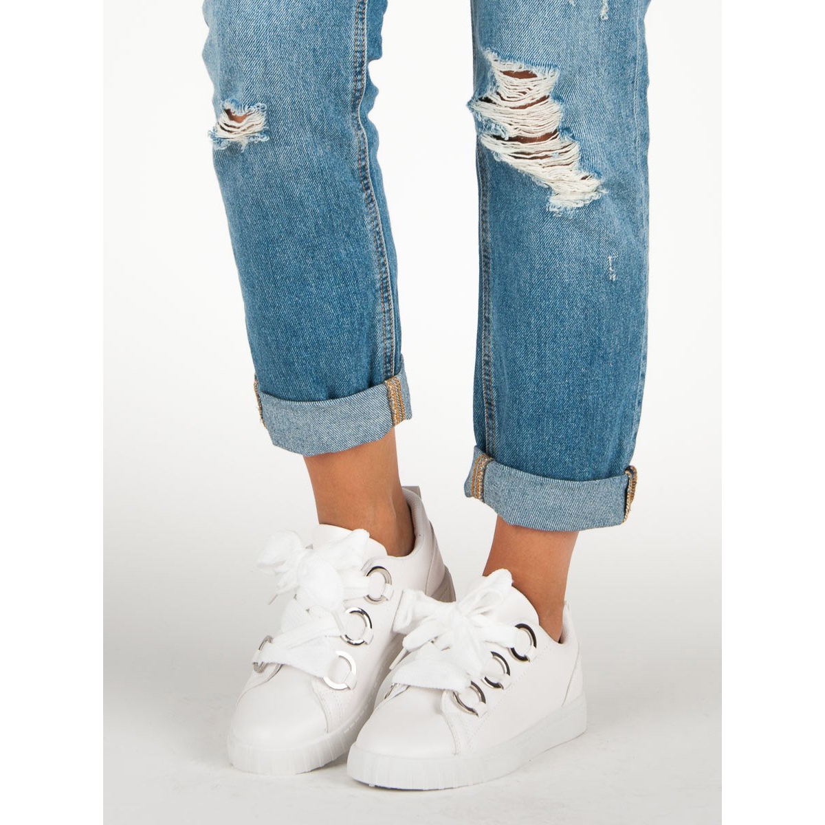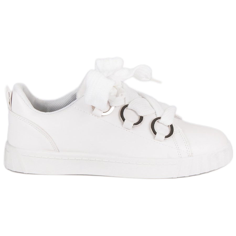 Odkryj wyjątkowy styl z białymi sznurowanymi trampkami Super Me, które łączą w sobie sportowy luz z eleganckim wyrazem. Te modne buty damskie wyróżniają się nietypowymi, szerokimi sznurówkami, zamocowanymi na efektownych metalowych srebrnych kółkach, co nadaje im unikalny charakter.