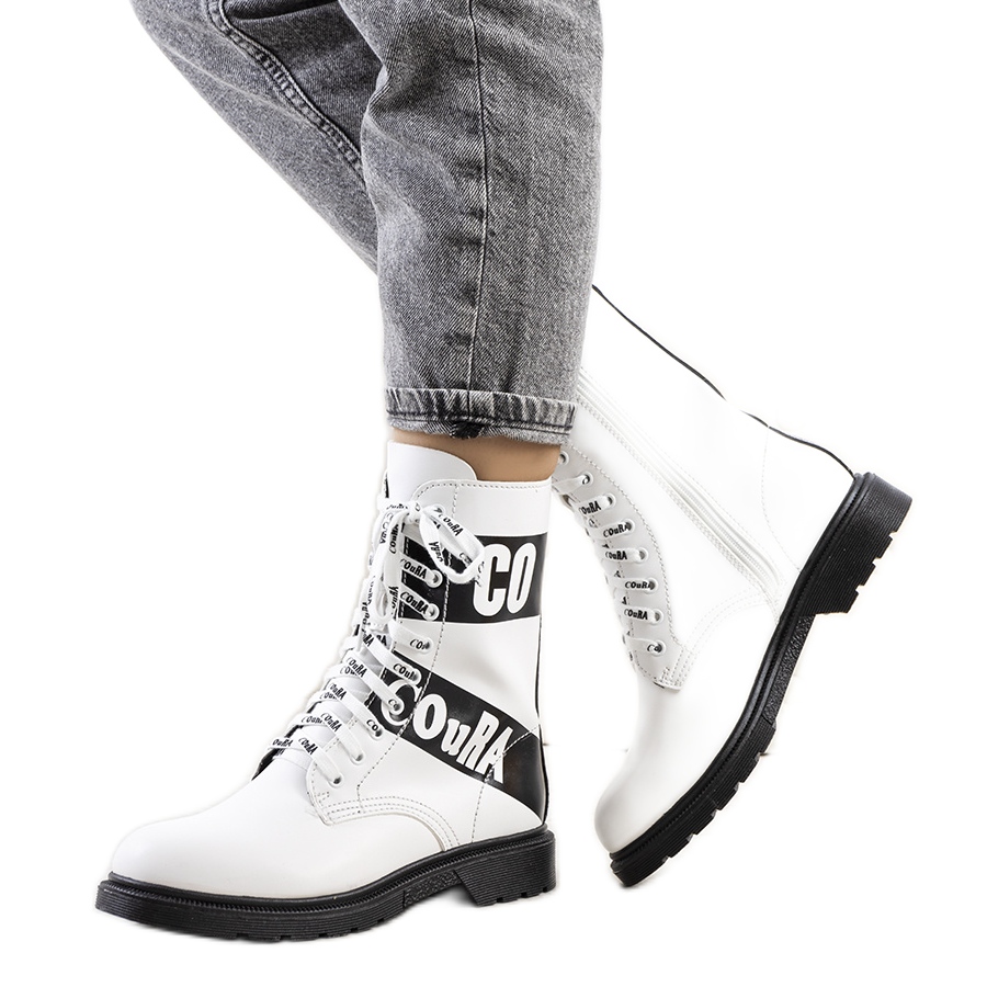Świetne do casualowych looków — jeansy, cargo, oversize’owe swetry, a także do dziewczęcych sukienek z grubymi rajstopami. Białe traperki z napisami dodadzą charakteru każdej stylizacji i będą przyciągać spojrzenia.