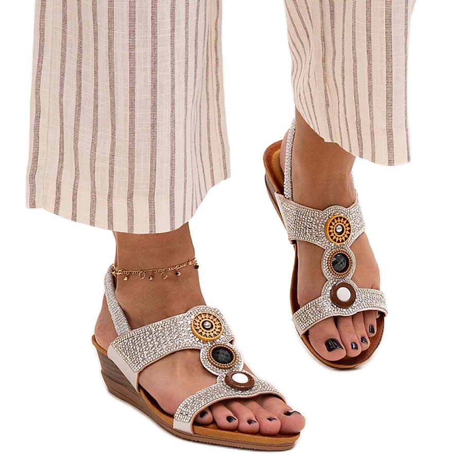 Sandały zdobione efektownymi cyrkoniami wprowadzają nutę blasku do każdej letniej stylizacji, sprawiając, że stają się one nieodłącznym elementem garderoby każdej modnej kobiety. Koturna o wysokości 4 cm dodaje im charakterystycznego wyglądu, który idealnie wpisuje się w aktualne trendy. Kolor srebrny w połączeniu z beżową podeszwą sprawia, że sandały te pasują do wielu outfitów — od zwiewnych sukienek po letnie szorty.