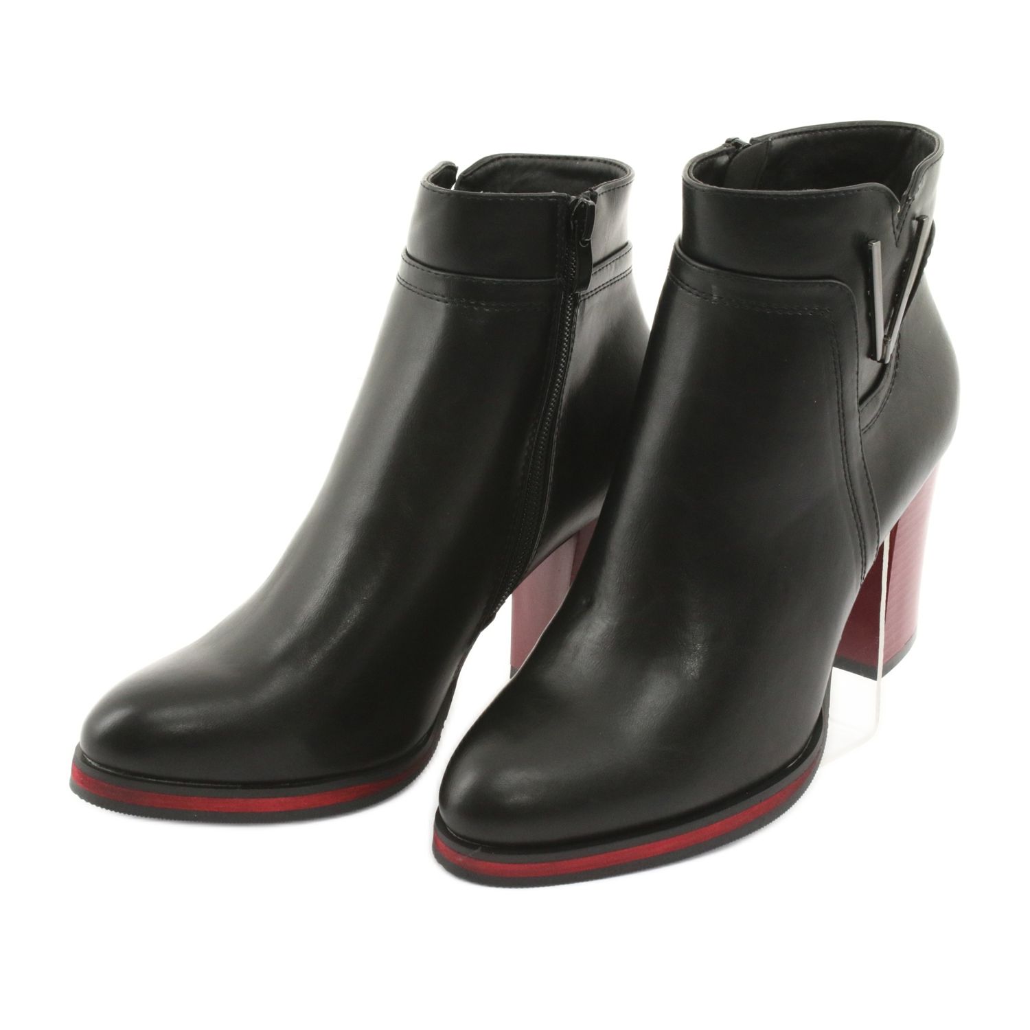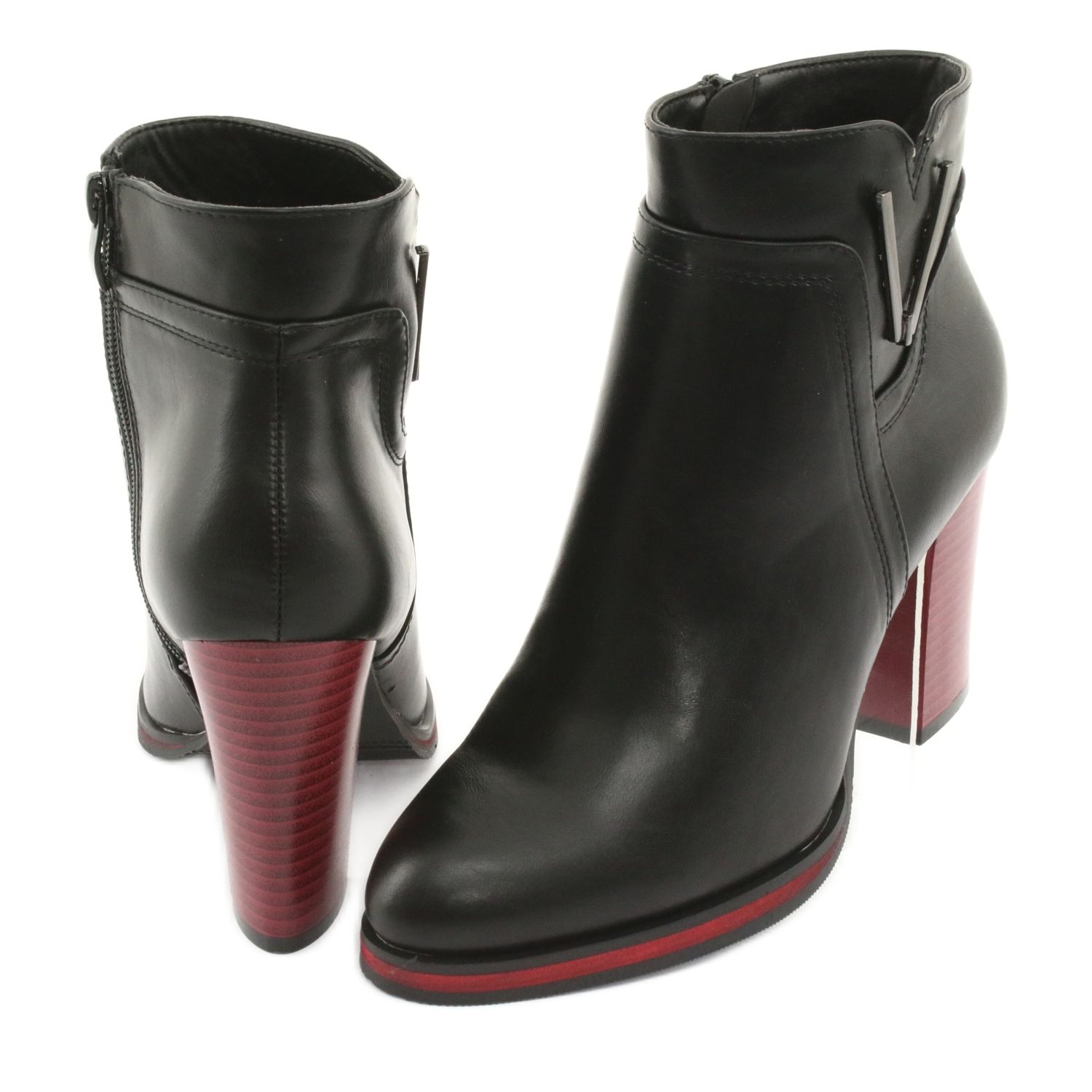 Ich wyjątkowy design wyróżnia czerwono-czarny obcas o wysokości 8,5 cm oraz subtelna ozdoba z boku, która dodaje im charakteru. Wygodny, migdałowy noszek sprawia, że botki są nie tylko stylowe, ale również komfortowe w noszeniu. Wyściełane przyjemnym futerkiem, gwarantują odpowiednie ocieplenie nawet w chłodniejsze dni.
