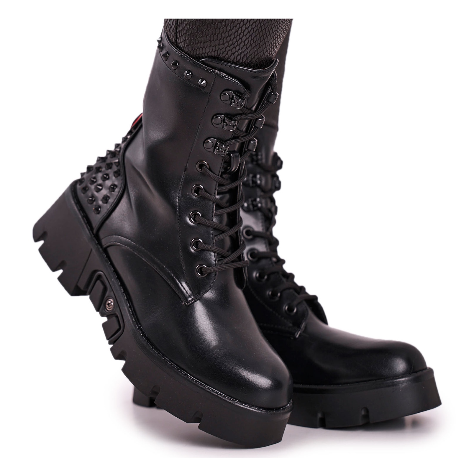 Botki Damskie Na Platformie FG2 w stylu Grunge to idealna propozycja dla kobiet, które pragną dodać swojej stylizacji charakterystycznego, mocniejszego akcentu. Te czarne botki wyróżniają się solidną, wysoką platformą oraz nietuzinkowym zdobieniem w postaci czarnych dżetów. Klasyczny fason ze sznurowaniem, uzupełniony o praktyczny zamek błyskawiczny z boku, zapewnia nie tylko modny wygląd, ale również wygodę i łatwość zakładania.