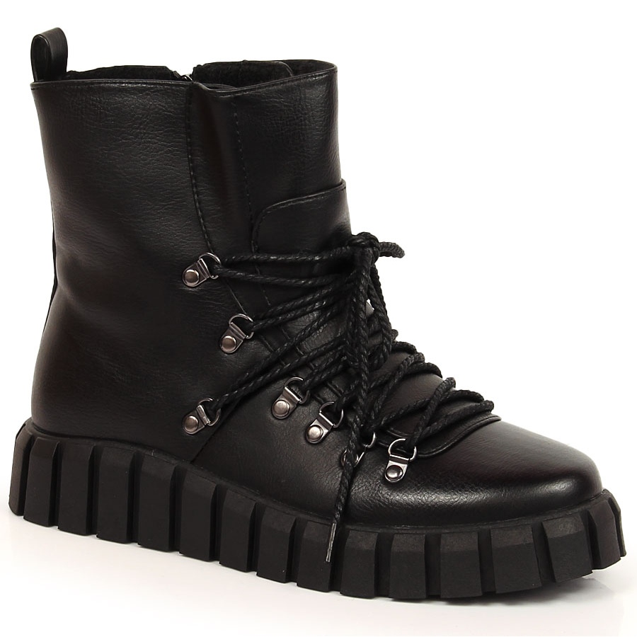 Konstrukcja obuwia łączy w sobie casualowy design z praktycznymi cechami, tworząc produkt zarówno na co dzień, jak i na wyjątkowe okoliczności. Wyraziste, czarne botki wykonane są z wysokiej jakości skóry ekologicznej i uzupełnione grubsza podeszwą. Subtelne detale takie jak zapięcie na zamek oraz sznurowanie ułatwiają dopasowanie buta do stopy oraz zapewniają wygodę użytkowania.