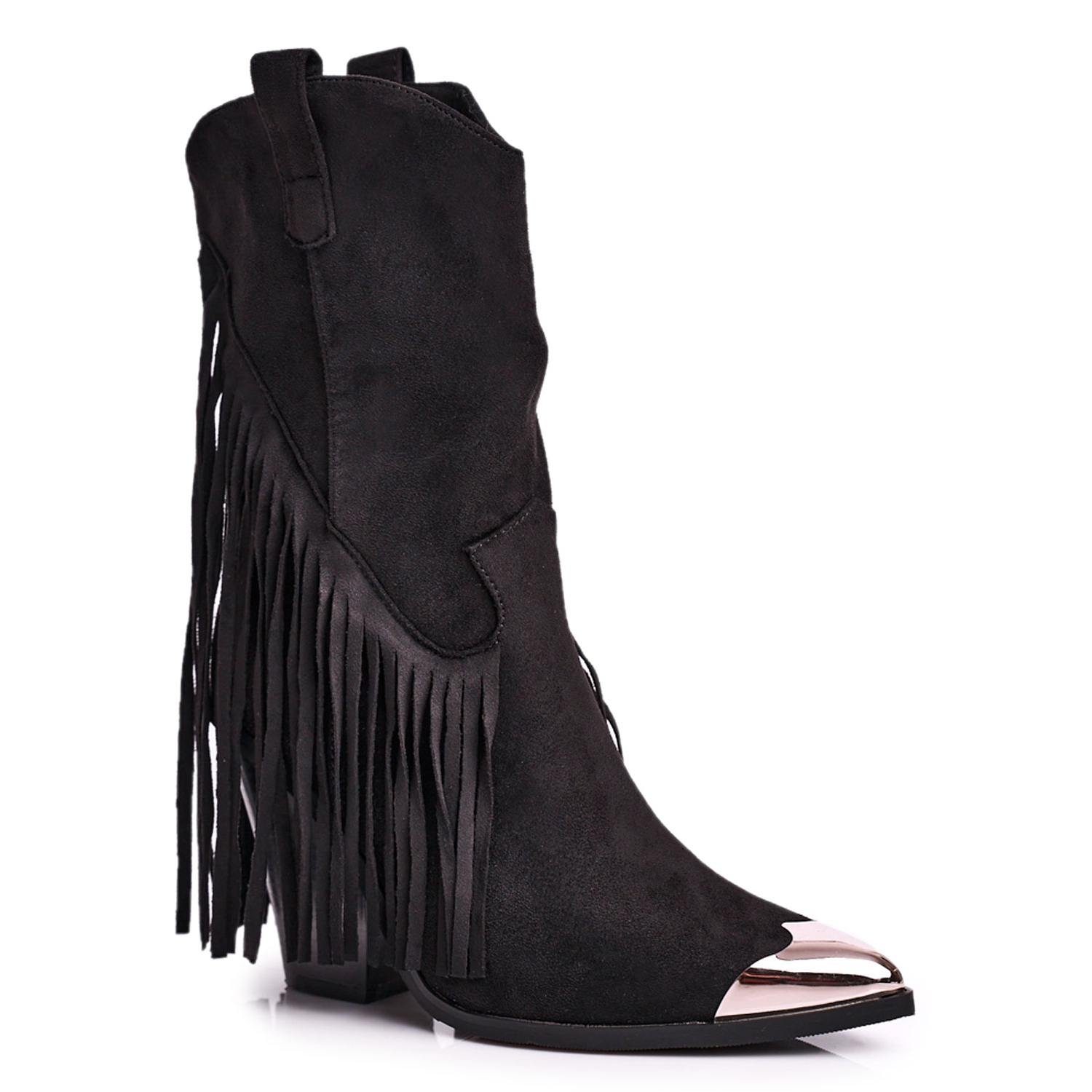Szczegóły: Botki Damskie Z Frędzlami Zamszowe Kowbojki Czarne Jessica srebrny