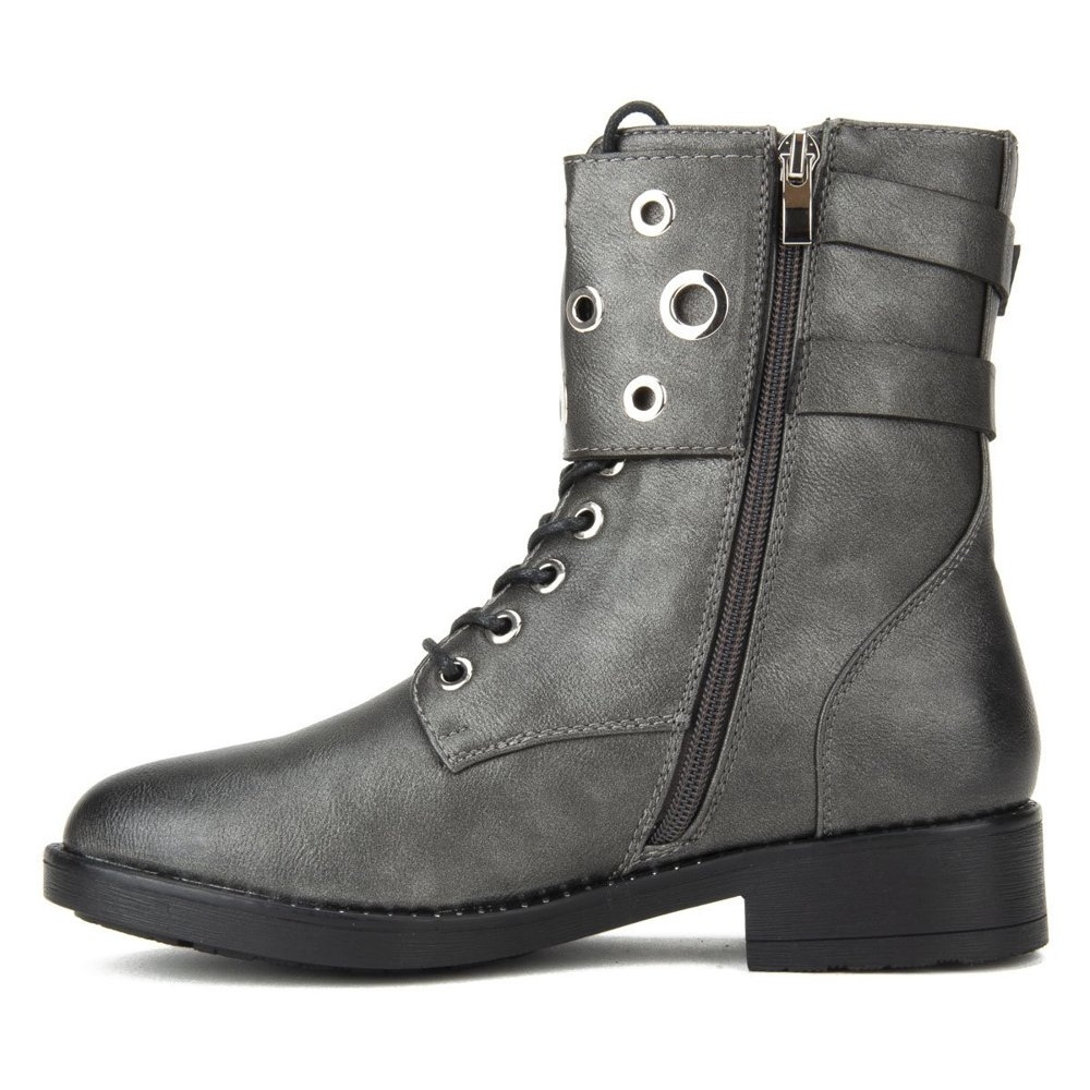 Wnętrze wykończone materiałem innego typu zapewnia komfort noszenia, a zapięcie na zamek sprawia, że zakładanie i zdejmowanie butów jest szybkie i łatwe. Te botki będą doskonałym uzupełnieniem każdej garderoby, a ich uniwersalny szary kolor pozwoli na łatwe dopasowanie do różnorodnych stylizacji.
