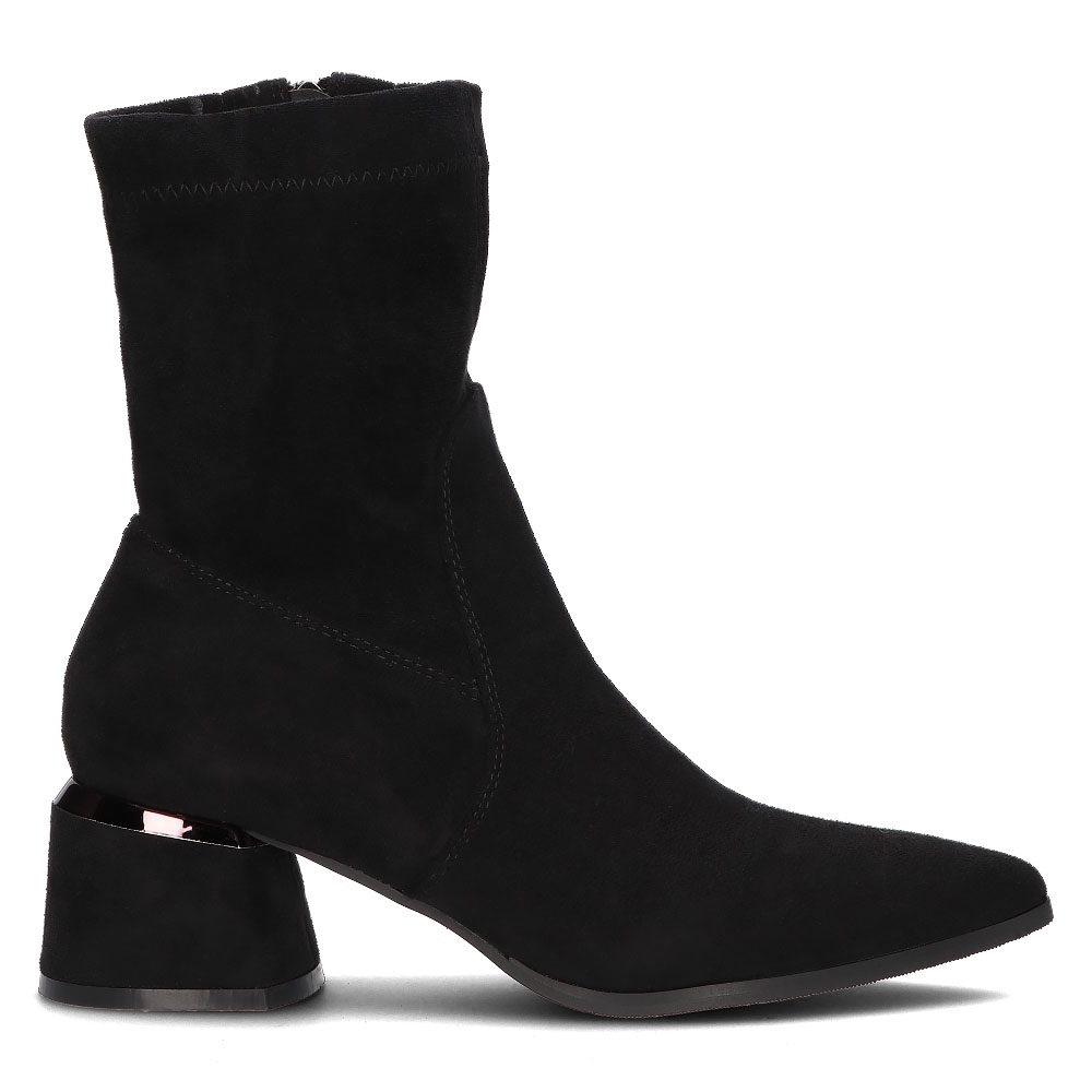 Oto czarne botki Filippo DBT1542/21 Bk, idealne dla kobiet, które cenią sobie zarówno styl, jak i komfort. Wykonane z wysokiej jakości ekologicznej skóry zamszowej, te botki wyróżniają się eleganckim, szpiczastym noskiem i praktycznym zapięciem na zamek, co ułatwia ich zakładanie.