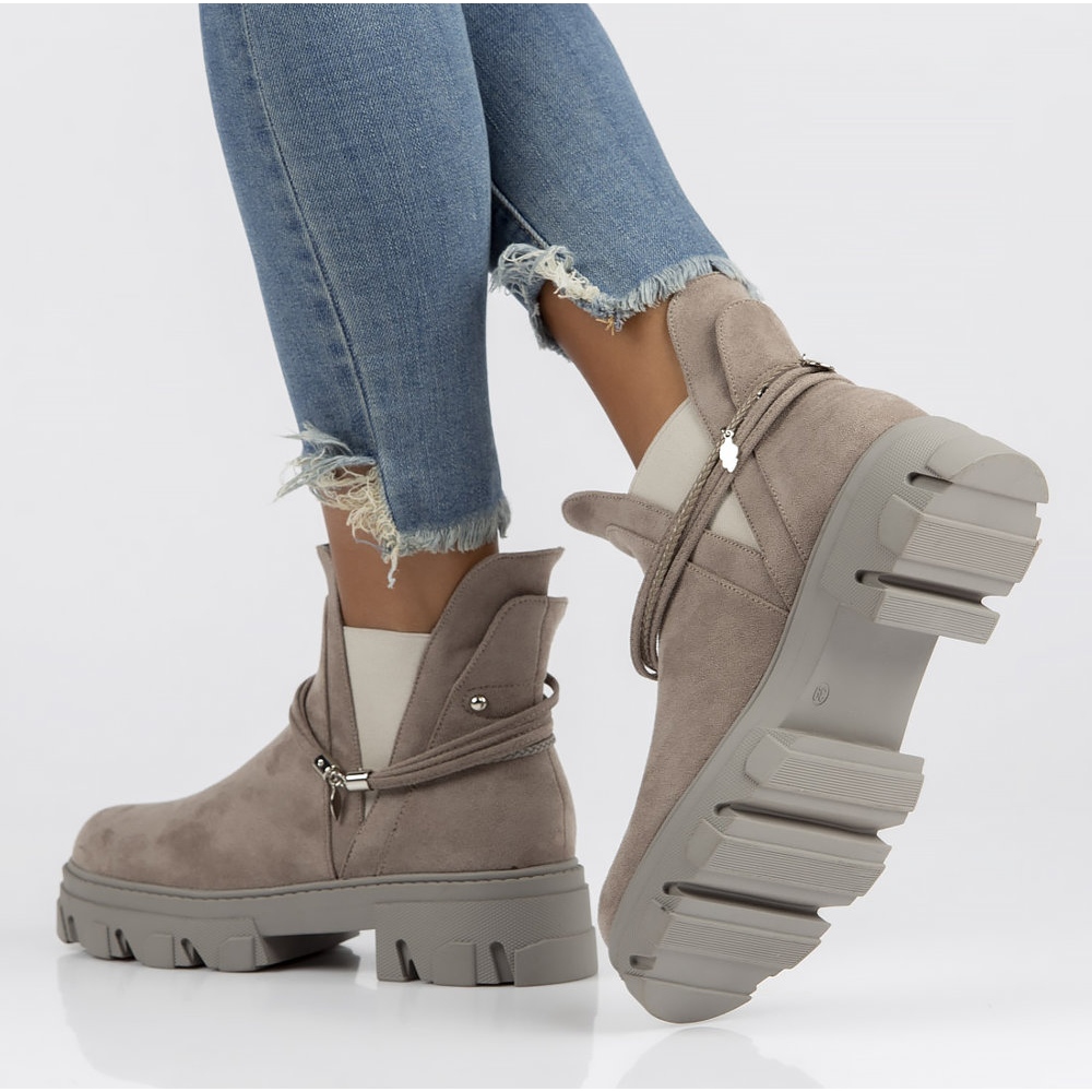 Ciekawym akcentem są dekoracyjne łańcuchy, które przyciągają wzrok i nadają butom charakteru. Wnętrze botków wyłożone jest materiałem, co umożliwia przyjemne noszenie bez uczucia dyskomfortu. Dzięki neutralnemu kolorowi, te szare botki łatwo dopasujesz do wielu stylizacji, zarówno casualowych, jak i nieco bardziej eleganckich.