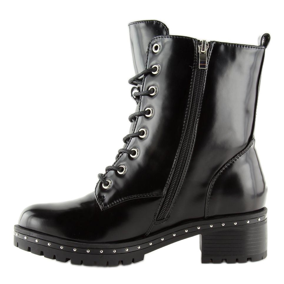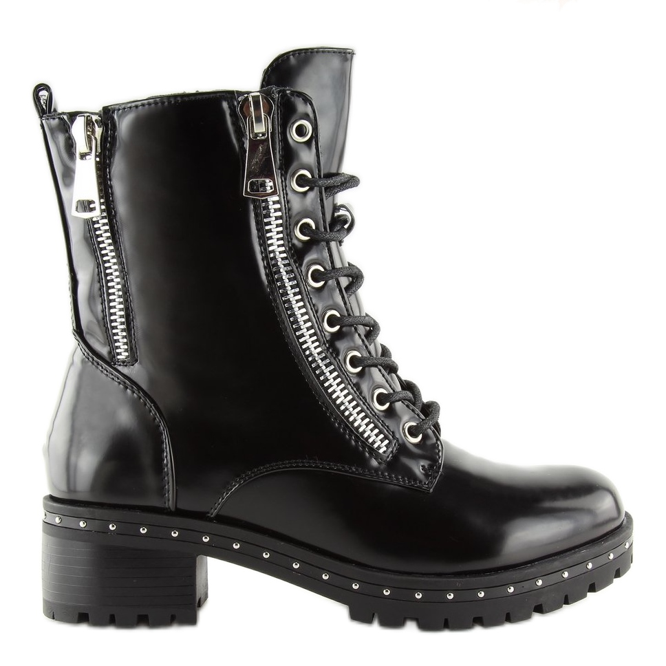 Botki glany damskie czarne A-40 black to idealna propozycja dla kobiet, które pragną dodać swojej garderobie odrobinę rockowego stylu. Wykonane w całości z wysokiej jakości skóry ekologicznej, te botki wyróżniają się lakierowanym wykończeniem, które przyciąga wzrok. Efektowne ćwieki wzdłuż podeszwy oraz ozdobne srebrne zamki to detale, które nadają im charakteru i sprawiają, że z pewnością będą wyróżniać się w tłumie.