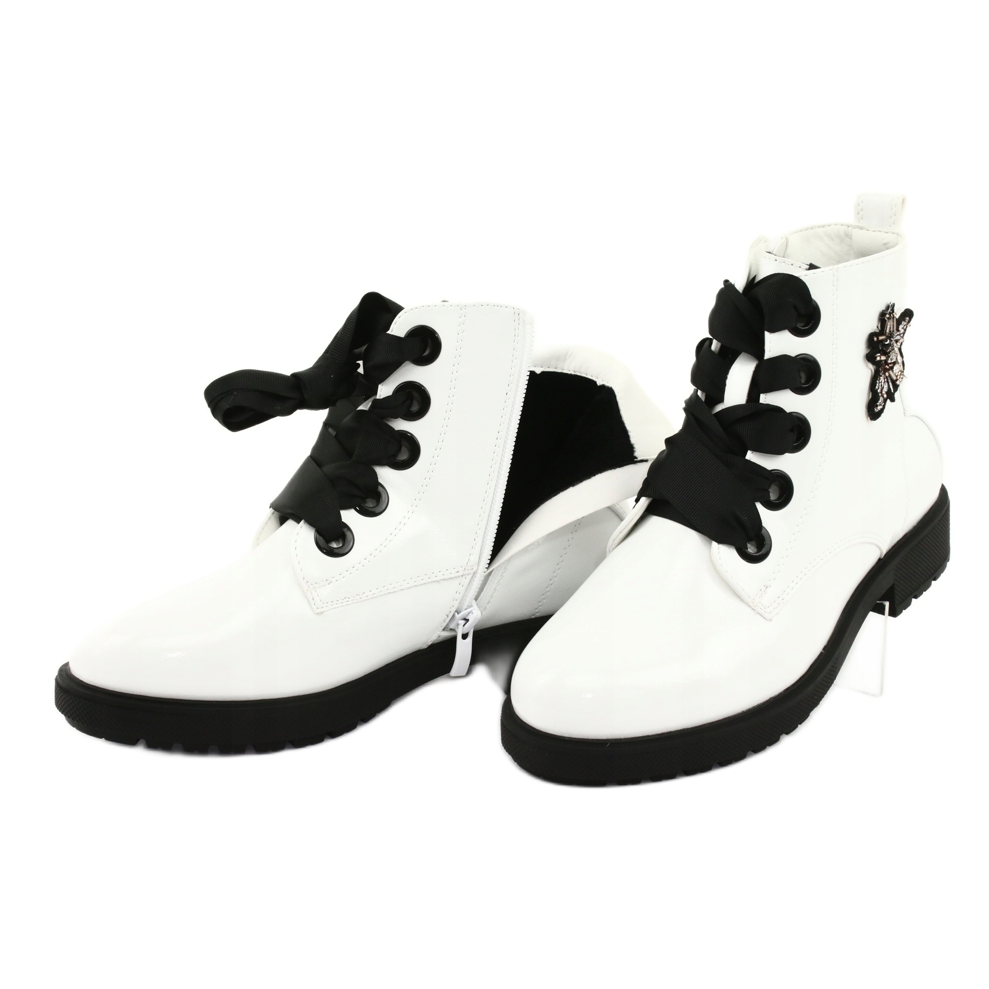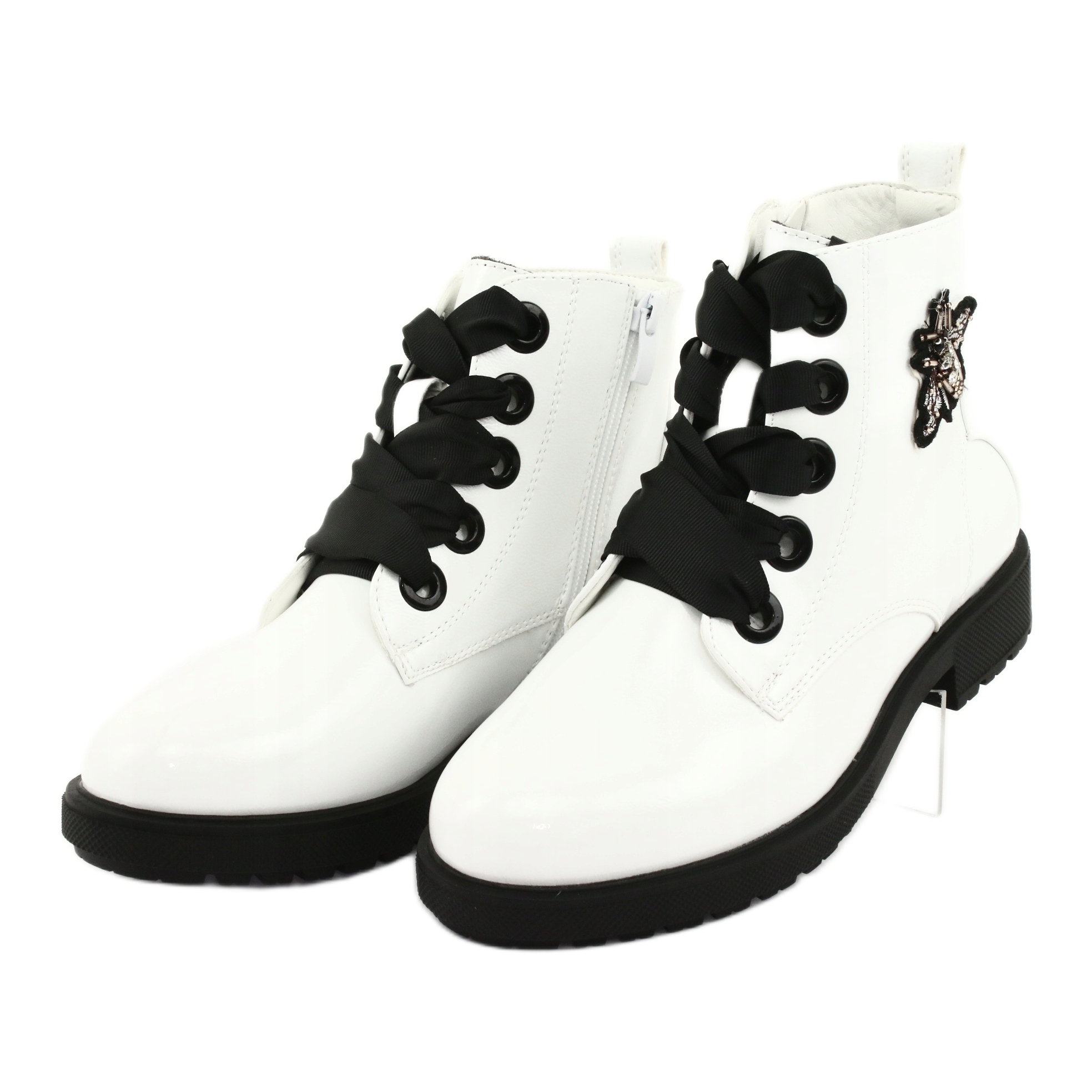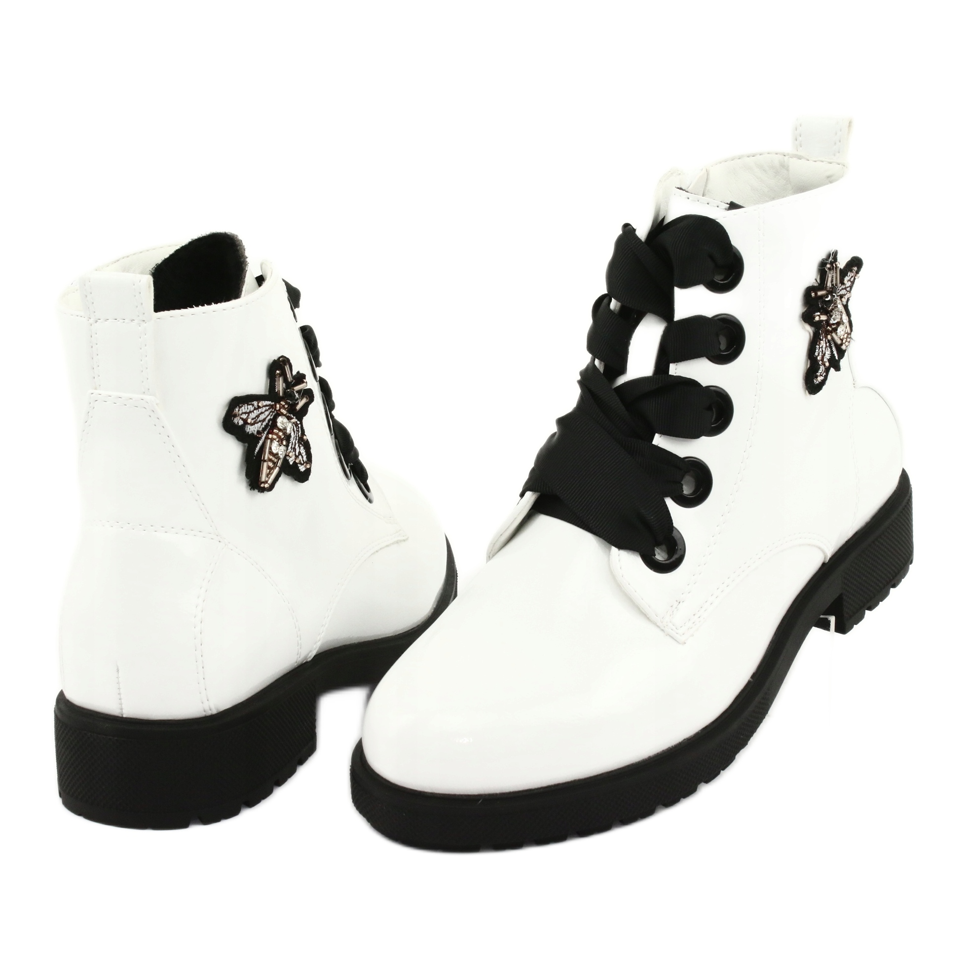 Botki lakierowane "Mucha" Sergio Leone 530 w białym i czarnym kolorze to doskonały wybór dla kobiet, które cenią sobie styl oraz komfort. Wykonane z wysokiej jakości ekologicznej skóry lakierowanej, zachwycają nie tylko estetyką, ale i funkcjonalnością. Dzięki modnym detalom w postaci stylowej muchy oraz subtelnych cyrkonii i dżetów, każdy krok w tych botkach przyciąga spojrzenia.