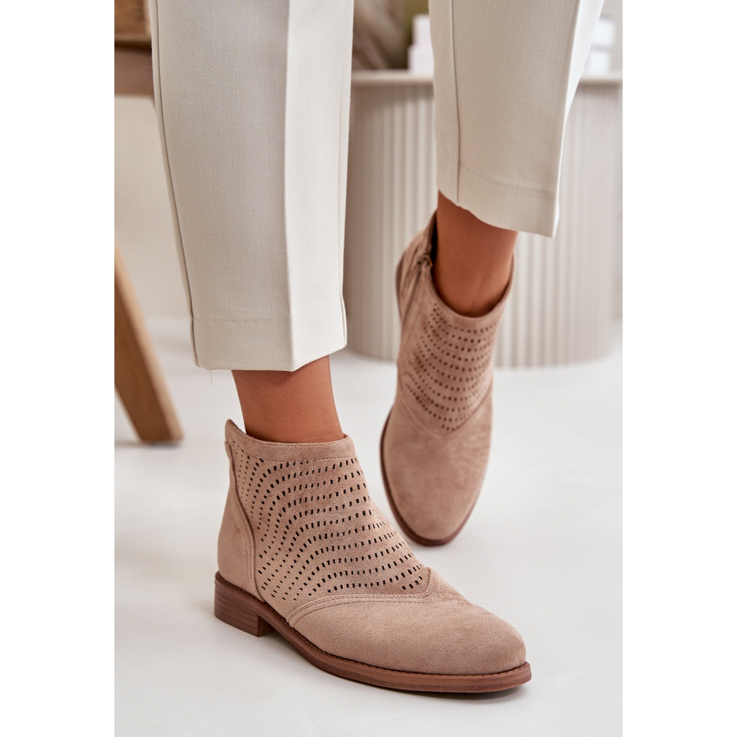 Wysokość cholewki wynosi 9 cm, co sprawia, że botki te doskonale adaptują się do różnych typów nóg. Dzięki uniwersalnemu beżowemu kolorowi z łatwością dopasujesz je do wielu stylizacji, a ich klasyczny fason sprawia, że będą świeżym akcentem w każdej garderobie.