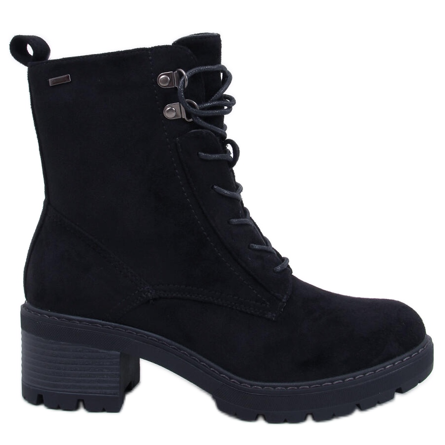 Eleganckie, czarne botki Reed Black łączą ponadczasowy fason z komfortem użytkowania. Wykonane z miłego w dotyku zamszu ekologicznego, z delikatnym futerkiem wewnątrz, sprawdzą się idealnie w chłodniejsze dni. Szeroki, stabilny obcas typu klocek o wysokości 5,5 cm oraz protektor na podeszwie gwarantują pewny krok, a połączenie sznurowania i praktycznego zamka ułatwia dopasowanie i szybkie zakładanie.