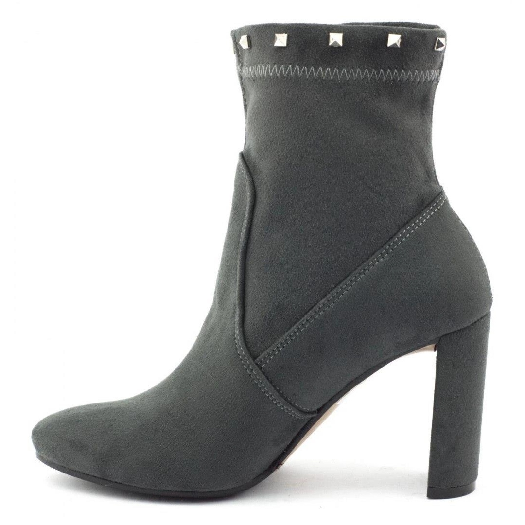 Eleganckie botki damskie Neścior 090-A łączą modny, rockowy charakter z wygodą użytkowania. Z zewnątrz wykonane ze skóry ekologicznej w grafitowym odcieniu z wielokolorowymi akcentami, wewnątrz mają naturalną wkładkę skórzaną, co zapewnia komfort chodzenia przez cały dzień. Cholewka sięga za kostkę i jest ozdobiona dżetami oraz ćwiekami, a zaokrąglony nosek dodaje uniwersalnego wyglądu.