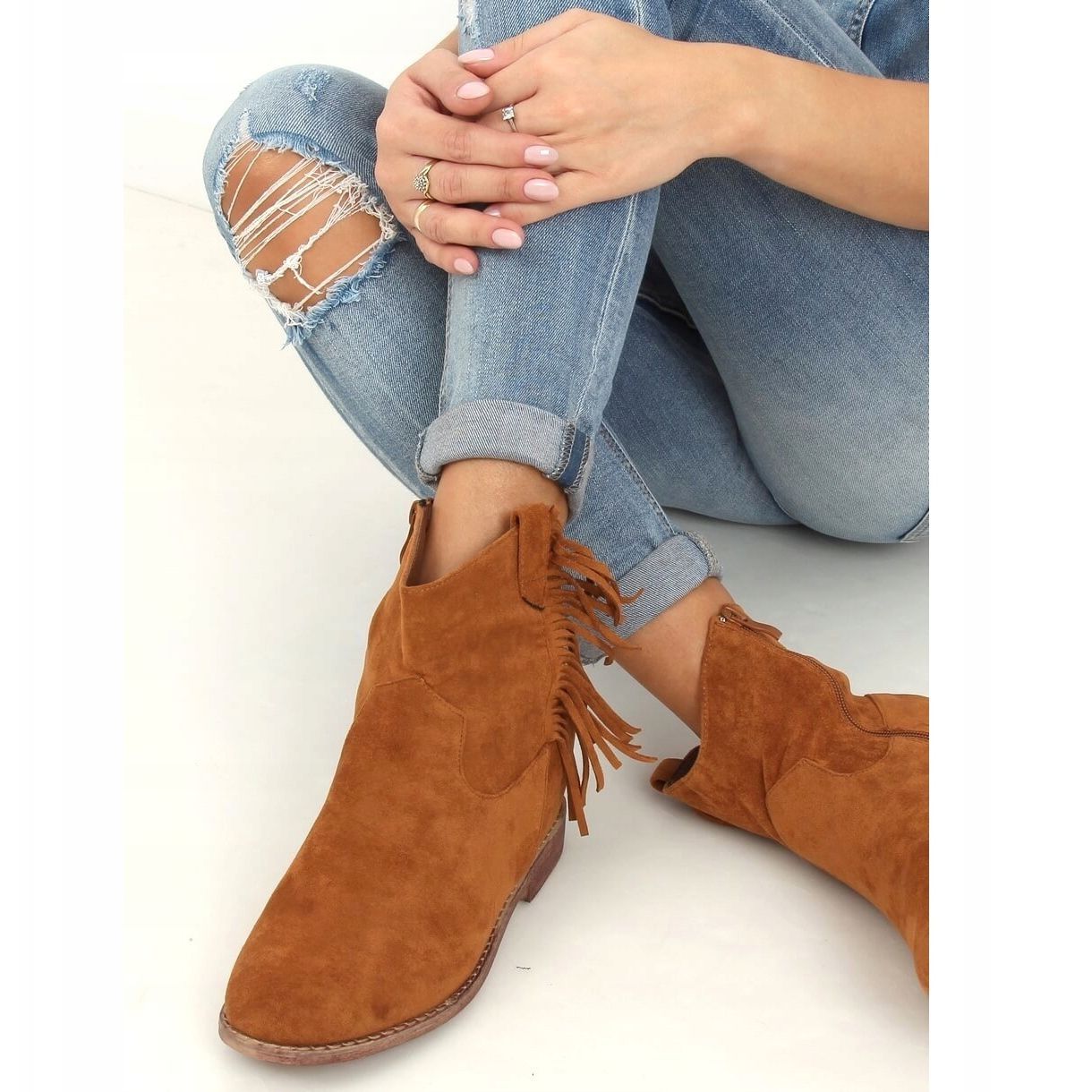 Cholewka tych botków została ozdobiona stylowymi frędzelkami, co nadaje im niepowtarzalnego boho charakteru. Dzięki praktycznemu zapięciu na zamek błyskawiczny, ich zakładanie i zdejmowanie jest niezwykle wygodne. Wykonane z ekologicznego zamszu, botki oferują nie tylko elegancki wygląd, ale także przyjazność dla środowiska.