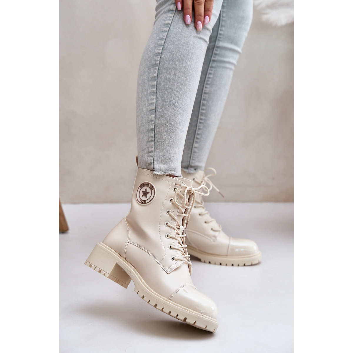 Model ten łączy funkcjonalność z klasycznym designem. Botki zapinane są na zamek i dodatkowo sznurowane, co pozwala na doskonałe dopasowanie do stopy oraz gwarantuje wygodę podczas noszenia. Okrągły nosek oraz płaski obcas o wysokości 4 cm sprawiają, że są one komfortowe, nawet przy dłuższym użytkowaniu.