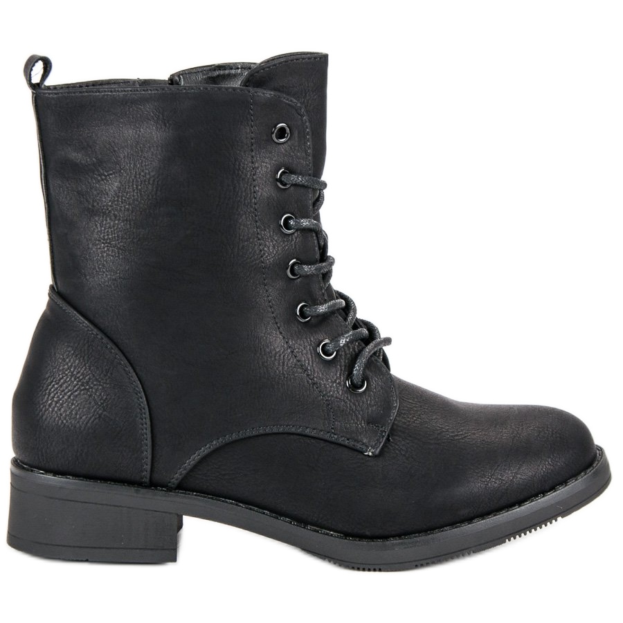Czarny kolor tych botków sprawia, że świetnie komponują się z różnorodnymi stylizacjami - od casualowych po bardziej eleganckie. Zapięcie na sznurówki oraz dodatkowy zamek ułatwiają zakładanie, zapewniając jednocześnie odpowiednie dopasowanie do stopy. Okrągły nosek i płaski obcas o wysokości 3,5 cm dodają wygody, a szerokość cholewki wynosząca 26 cm oraz jej wysokość 16 cm sprawiają, że botki są nie tylko praktyczne, ale także estetyczne.