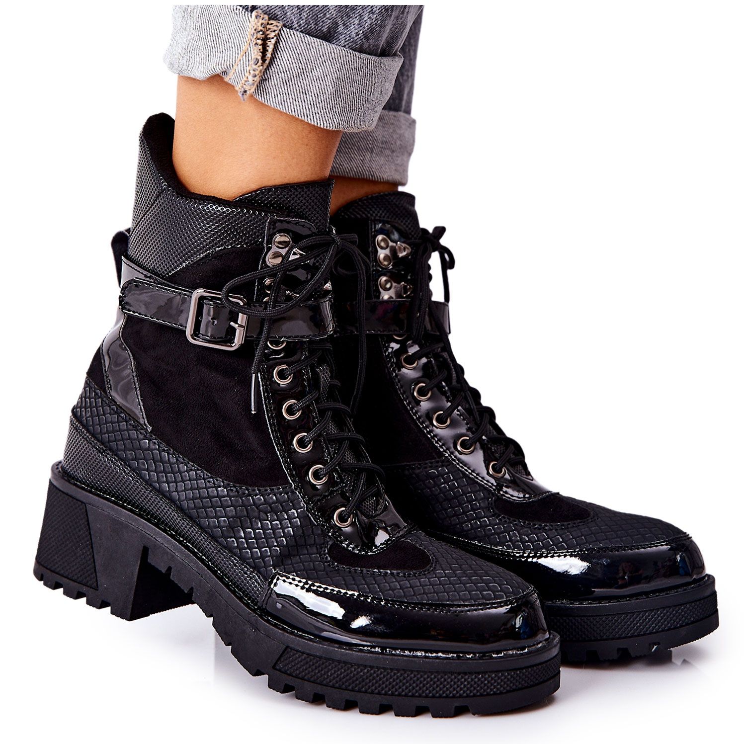 Botki wyróżniają się wnętrzem ocieplonym kocem obuwniczym, dzięki czemu zapewniają ciepło w chłodniejsze dni. Stabilny obcas o wysokości 5 cm dodaje pewności kroku, a płaska podeszwa zwiększa komfort noszenia. Z kolei suwak na boku oraz sznurowane wiązanie sprawiają, że zakładanie obuwia to prawdziwa przyjemność. Dodatkowe zapięcie na regulowany pasek z klamrą to nie tylko funkcjonalność, ale także modny akcent, który podkreśla charakterystyczny wygląd botków.