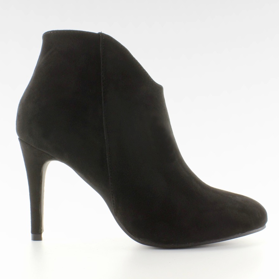 Eleganckie, zgrabne botki na smukłej szpilce 9,5 cm, wykonane z mięsistego zamszu ekologicznego. Model sięgający za kostkę z delikatnym futerkiem w środku, okrągłym noskiem i modnym wycięciem z przodu cholewki, które wysmukla optycznie nogę. Wsuwane, bardzo wygodne — idealne na chłodniejsze dni, kiedy zależy Ci na stylu i komforcie.