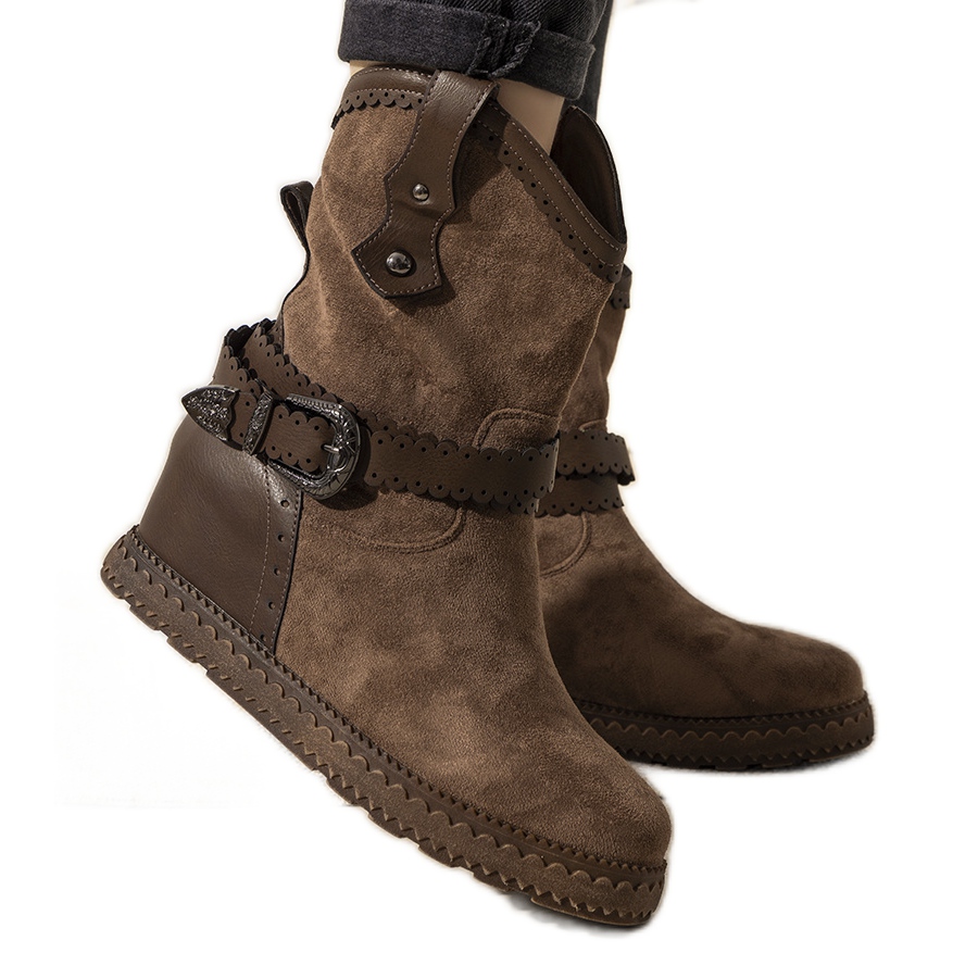 Inna marka Brązowe damskie botki ocieplane na koturnie Sherry