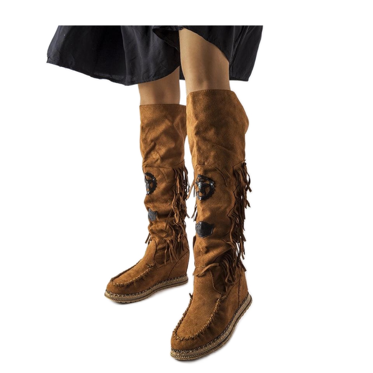 Inna marka Brązowe kozaki na koturnie z frędzlami