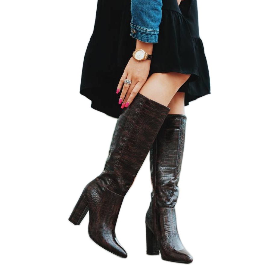 Przedstawiamy brązowe kozaki na słupku Phoebo – idealny wybór na zimowy sezon, który podkreśli Twój elegancki styl. Te ciemnobrązowe kozaki zostały wykonane z materiału skóropodobnego, a ich niesamowity krokodyli wzór dodaje im oryginalności i wyjątkowego charakteru.