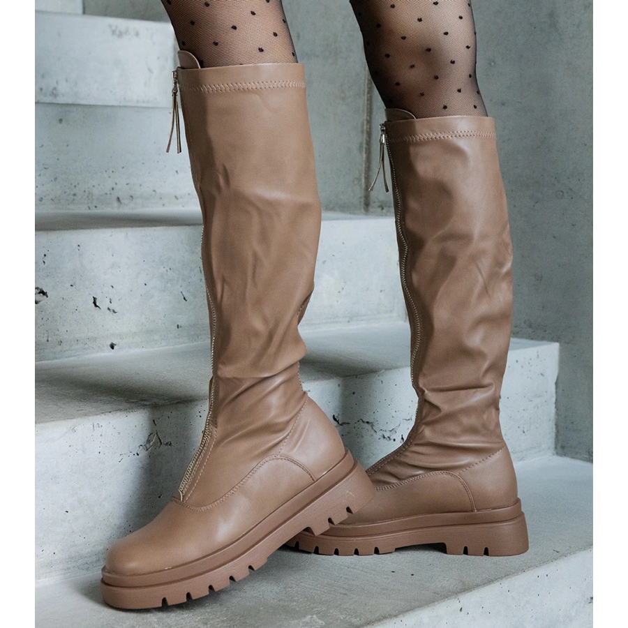 Mają one wysokość do kolana (49 cm) i charakteryzują się okrągłym noskiem, co nie tylko podkreśla ich styl, ale również zapewnia wygodę podczas noszenia. Dzięki zapięciu na zamek, zakładanie i zdejmowanie kozaków jest szybkie i komfortowe. Brązowy kolor, znany jako Khaki, oraz brązowa podeszwa z gumy stanowią idealne połączenie, które doda charakteru każdej stylizacji.