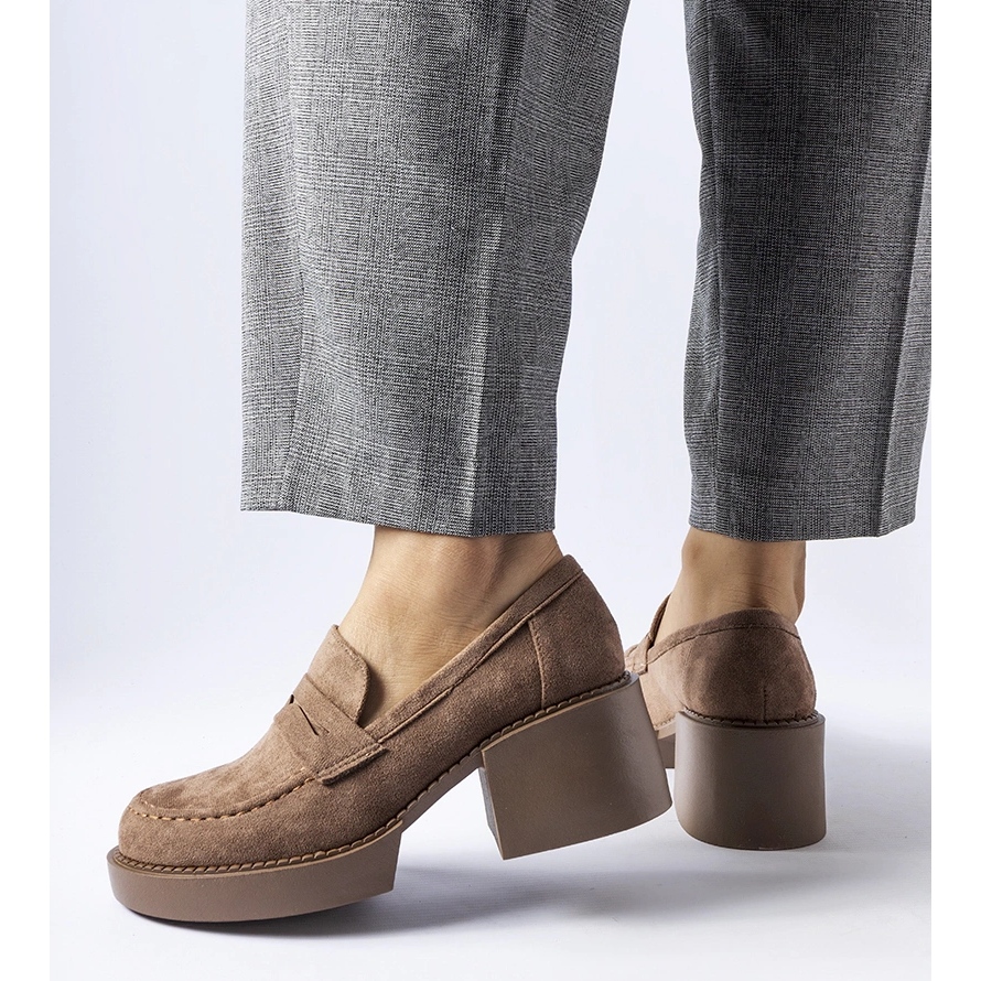 Szczegóły: Brązowe mokasyny na klocku eko-zamsz