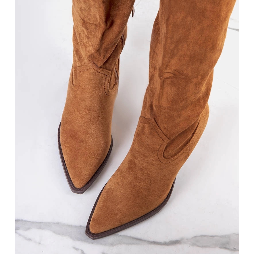 Brązowe ocieplane kowbojki Ezer — ponadczasowy fason i komfort na chłodniejsze dni. Wykonane z wysokiej jakości zamszowej skóry ekologicznej w odcieniu camel, te kozaki łączą klasyczny wygląd kowbojek z praktycznym, zimowym wykończeniem. Wnętrze ocieplone jest przyjemnym materiałem imitującym futerko, który zapewnia ciepło i wygodę przez cały sezon.