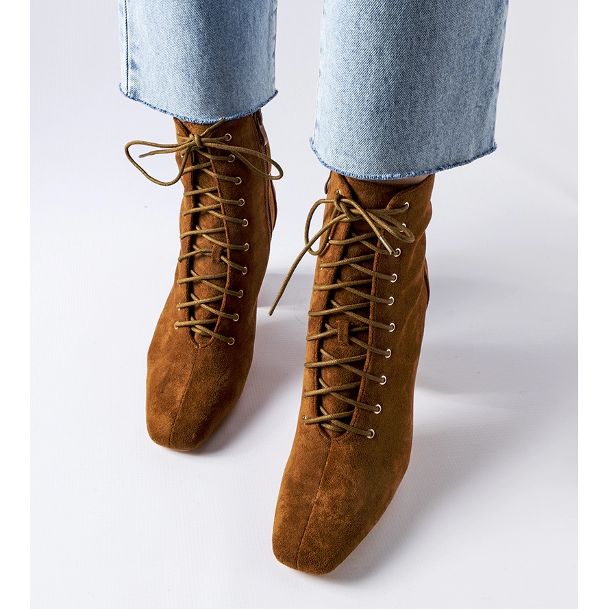 Brązowy kolor obuwia oraz minimalistyczny design bez zbędnych wzorów czynią te botki ponadczasowym dodatkiem do każdej garderoby. Sznurowanie nie tylko dodaje charakteru, ale umożliwia też idealne dopasowanie buta do stopy, zaś boczny zamek błyskawiczny zdecydowanie ułatwia szybkie zakładanie i ściąganie butów. Kwadratowy nosek nadaje botkom modny charakter, a słupkowy obcas o wysokości 9 cm to elegancki detal, który optycznie wyszczupla nogi oraz zapewnia stabilizację stopy.