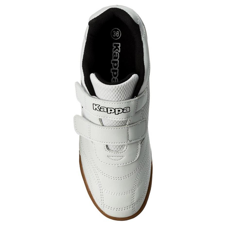 Lekko profilowane halówki dla dzieci Kappa Kickoff T, zaprojektowane do gry na hali oraz codziennego użytkowania. Przewaga bieli z czarnymi akcentami, komfortowa konstrukcja i wytrzymała, niebrudząca podeszwa.