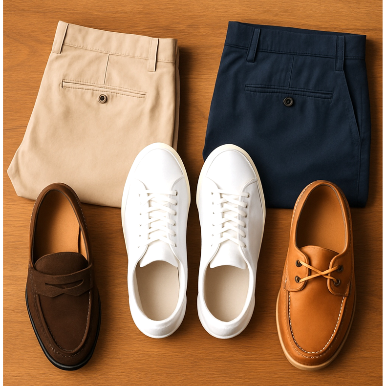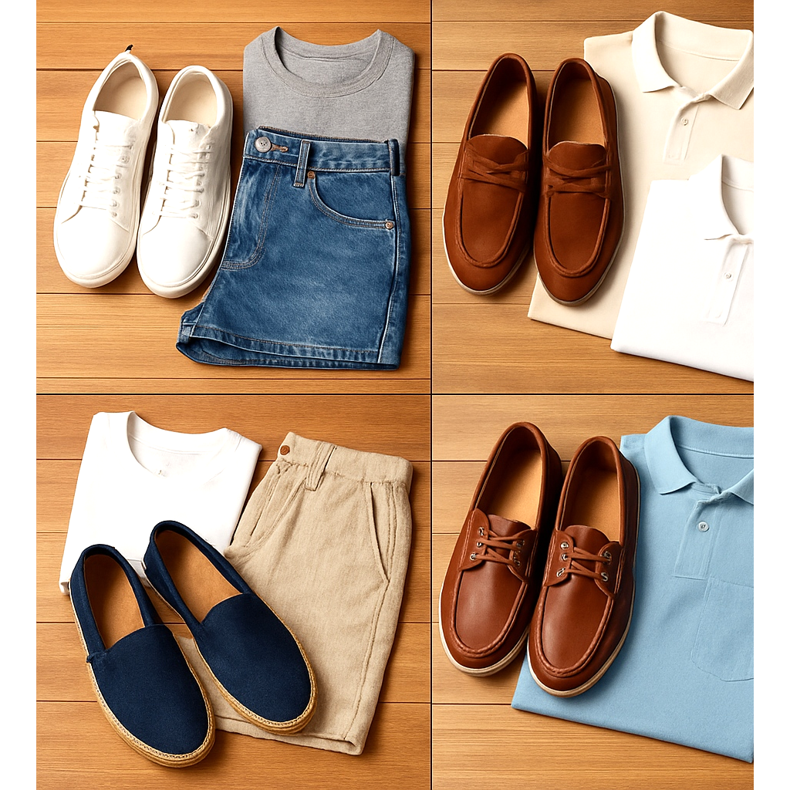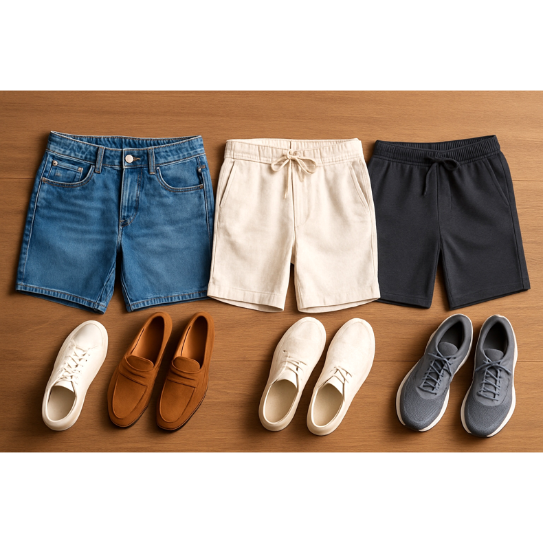 Ciemne szorty (granat, khaki) → jasne buty (białe sneakersy, tan loafers).