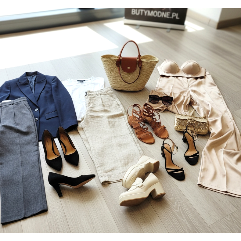 Na weekendowy wypad: jasne lub beżowe lniane wide-leg do kostki, biały t-shirt i sandaly gladiatorki lub loafersy na grubszej podeszwie. Komplet dopełnia słomkowa torebka i ciemne okulary — total summer vibes bez przesady. Na wieczorne wyjście: satynowe szerokie spodnie w kolorze szampana lub złotym, dopasowany gorset i sandaly na szpilce z paskiem przy kostce. Elegancja w czystej postaci, gotowa na specjalną okazję. Przeglądaj propozycje na butymodne.pl i skompletuj idealny outfit z szerokimi nogawkami!
