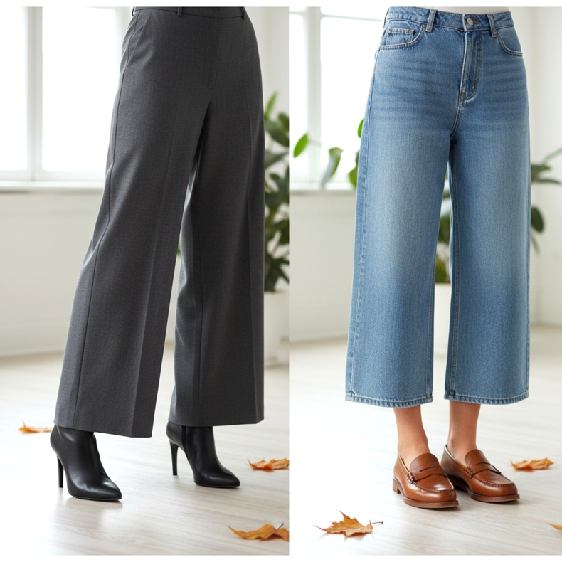 Jeśli chcesz nosić wide-leg z płaską podeszwą, wybierz modele skrócone — kończące się tuż nad kostką lub prosto w kostkę. W ten sposób unikasz efektu „przytłoczenia” przez materiał i zachowujesz lżajsze proporcje. Spodnie tipo culotte i cropped wide-leg są stworzone właśnie do noszenia z płaskimi butami i loąferami — ta kombinacja wygląda młodo i sportowo, a jednocześnie niesie w sobie nutkę klasy.