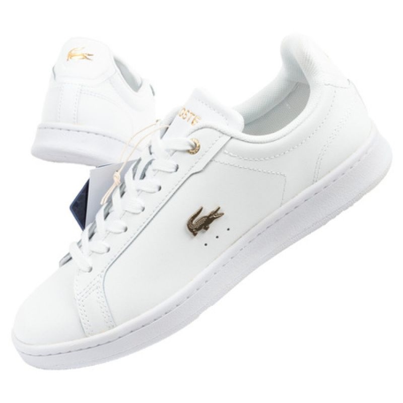 Buty Lacoste Carnaby Pro 40216 to eleganckie damskie obuwie sportowe, które łączy w sobie klasykę z nowoczesnym stylem. Wykonane z najwyższej jakości skóry naturalnej, charakteryzują się nie tylko wyjątkowym wyglądem, ale również dużą trwałością. Białe cholewki, zdobione złotym logo Lacoste oraz metalowym krokodylem, nadają butom eleganckiego akcentu, który doskonale komponuje się z każdą stylizacją.