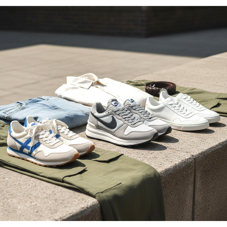Wiosna 2026 to sezon wąskich sneakersów nawiązujących do estetyki lat 70. i 80. Modele w stylu retro runnerowym — z wyraźną podeszwą, ale bez nadmiaru technicznych aplików — doskonale pasują do jeansów slim lub cargo pantów. Wybieraj modele w kolorach neutralnych: białym, kremowym lub szarym.