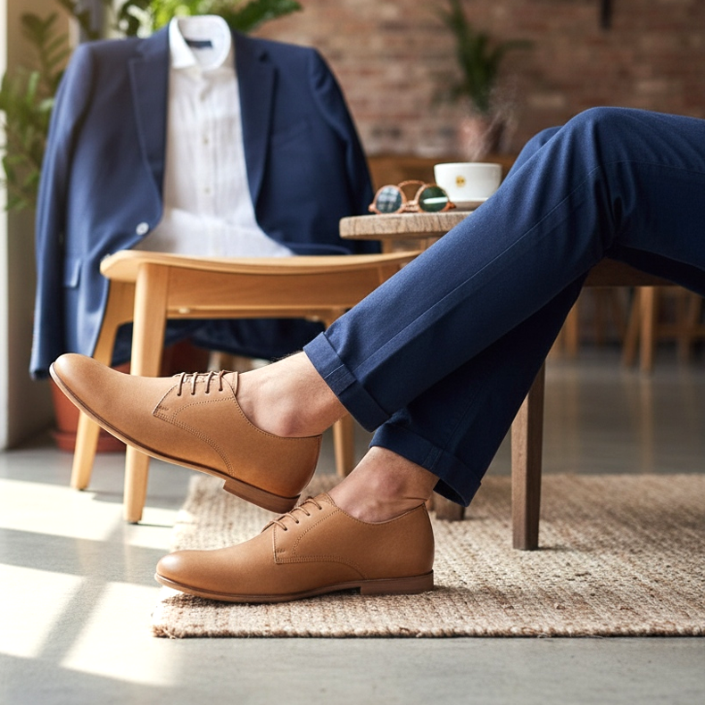 Derby dobrze wyglądają z podwiniętą nogawką spodni, odsaniając kostkę — to zabieg, który doda Twojemu look'owi nieformalnej elegancji. W kolorze jasno-brązowym lub tan zestawione z granatową marynarką i białą koszulą dają efekt idealnego smart casual na spotkanie z klientem lub popołudniową kawę w ciekawej kawiarni.