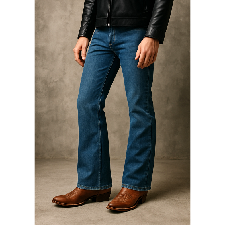 Jeansy bootcut i flare charakteryzują się rozszerzeniem od kolana w dół, stworzone specjalnie pod buty z cholewką. Najlepiej pasują: kowbojki (western boots), Chelsea boots, jodhpur boots, worker boots, wysokie sznurowane trzewiki. Nogawki powinny przykrywać cholewkę, opadając lekko na but. Unikaj niskich sneakersów – będą wyglądać zagubionych pod szeroką nogawką. Ciemne bootcut jeansy z czarnymi Chelsea boots i skórzaną kurtką to rockowy look. Jasne flare z brązowymi kowbojkami nadają stylizacji boho-country vibe. Ten krój jeansów wrócił do łask w nowoczesnej modzie męskiej.