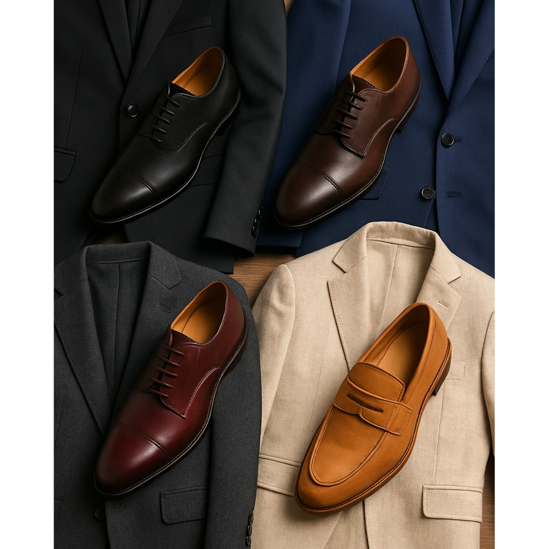 Jasne garnitury (lato: beż, lniane) → Jasne brązy (tan), loafersy brązowe.
