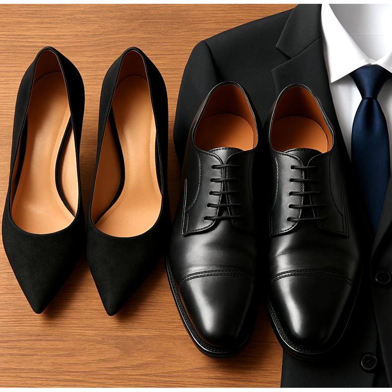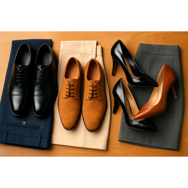 Środowisko korporacyjne wymaga konserwatywnego obuwia. Mężczyźni powinni nosić czarne lub ciemnobrązowe oksfordy lub derby. Kobiety sprawdzą się w czółenkach na średnim obcasie w neutralnych kolorach. Unikaj ekstrawaganckich wzorów, jaskrawych kolorów i nadmiernych ozdób. Prostota i klasyka są kluczem.
