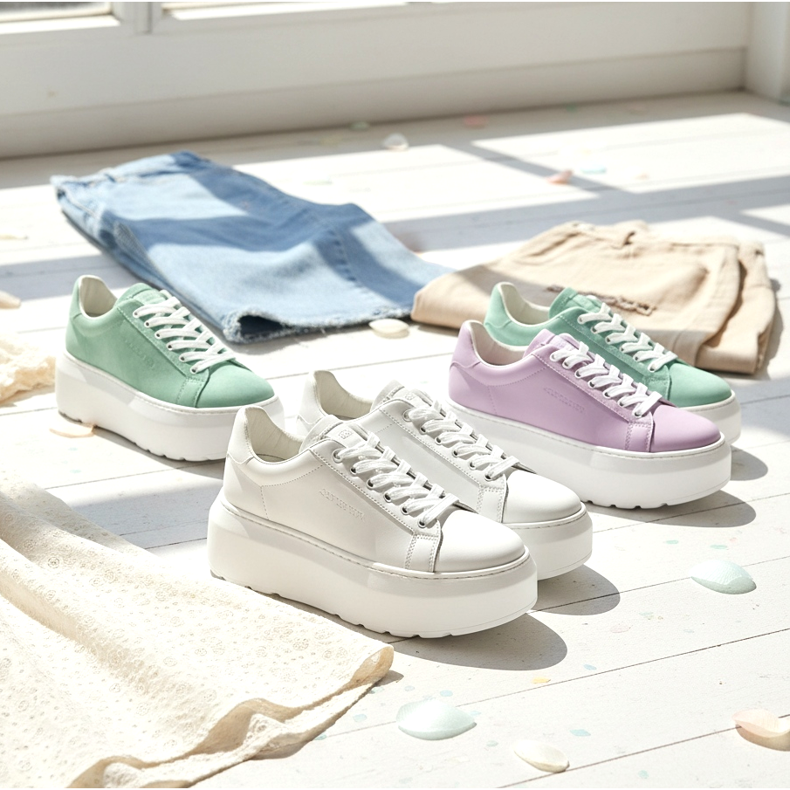 W kolorach bielą i krem dominują, ale coraz częściej pojawiają się też pastelowe sneakersy na platformie — miętowe, pudrowo-różowe i lawendowe. To świetna opcja dla osób szukających butow, które będą jednocześnie modne i wyraziste.